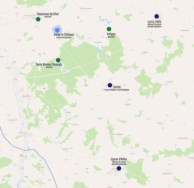 Les zones sont regroupées autour d’une antenne, lieu où s’organise le travail de l’équipe infirmière et du cadre en charge de la zone concernée. Un psychiatre en assure la coordination.